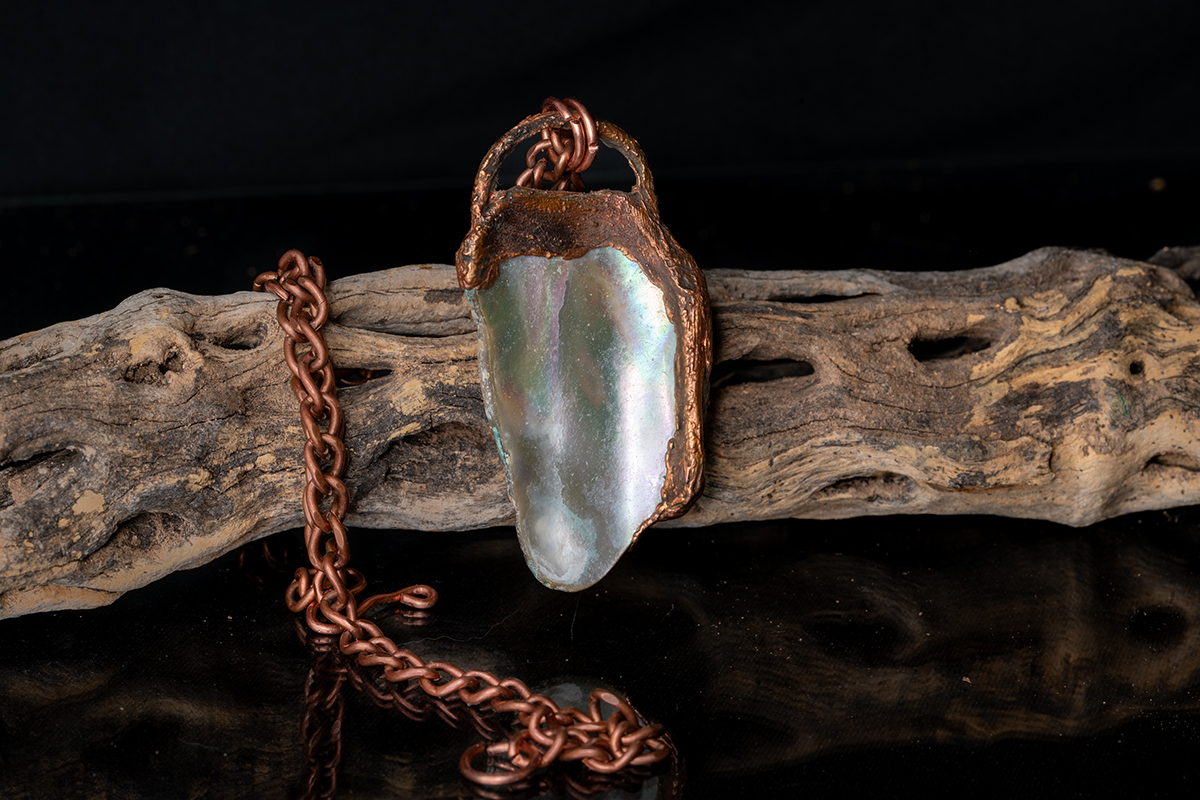Handmade Electroformed abalone necklace on a copper chain.