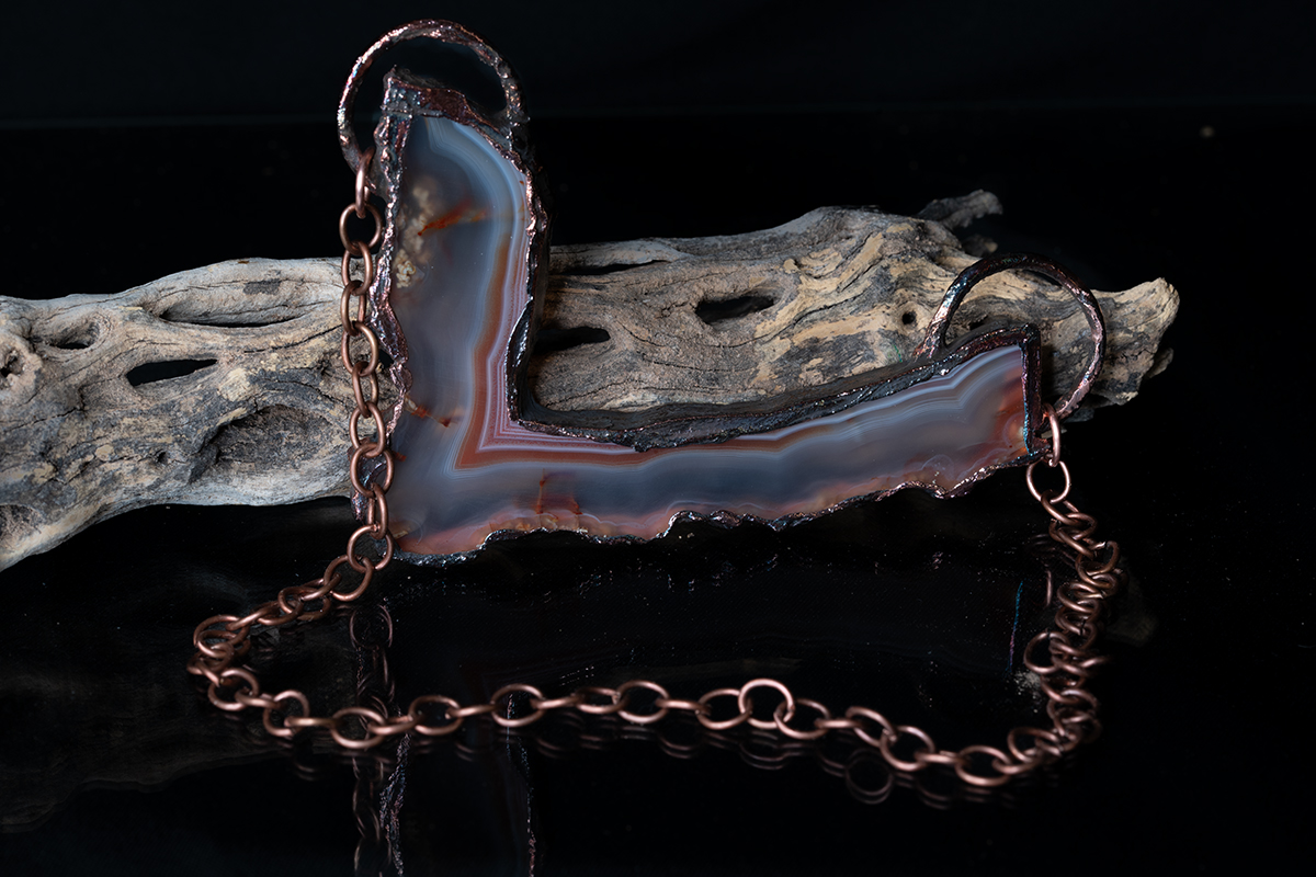 This is a gorgeous cross-section of lace agate that I have taken and electroformed into a necklace. I wanted to create this piece for years. This piece had been on my mind for years, and I’m thrilled with how it turned out. It would make an excellent gift for anyone who loves minerals, agates especially.