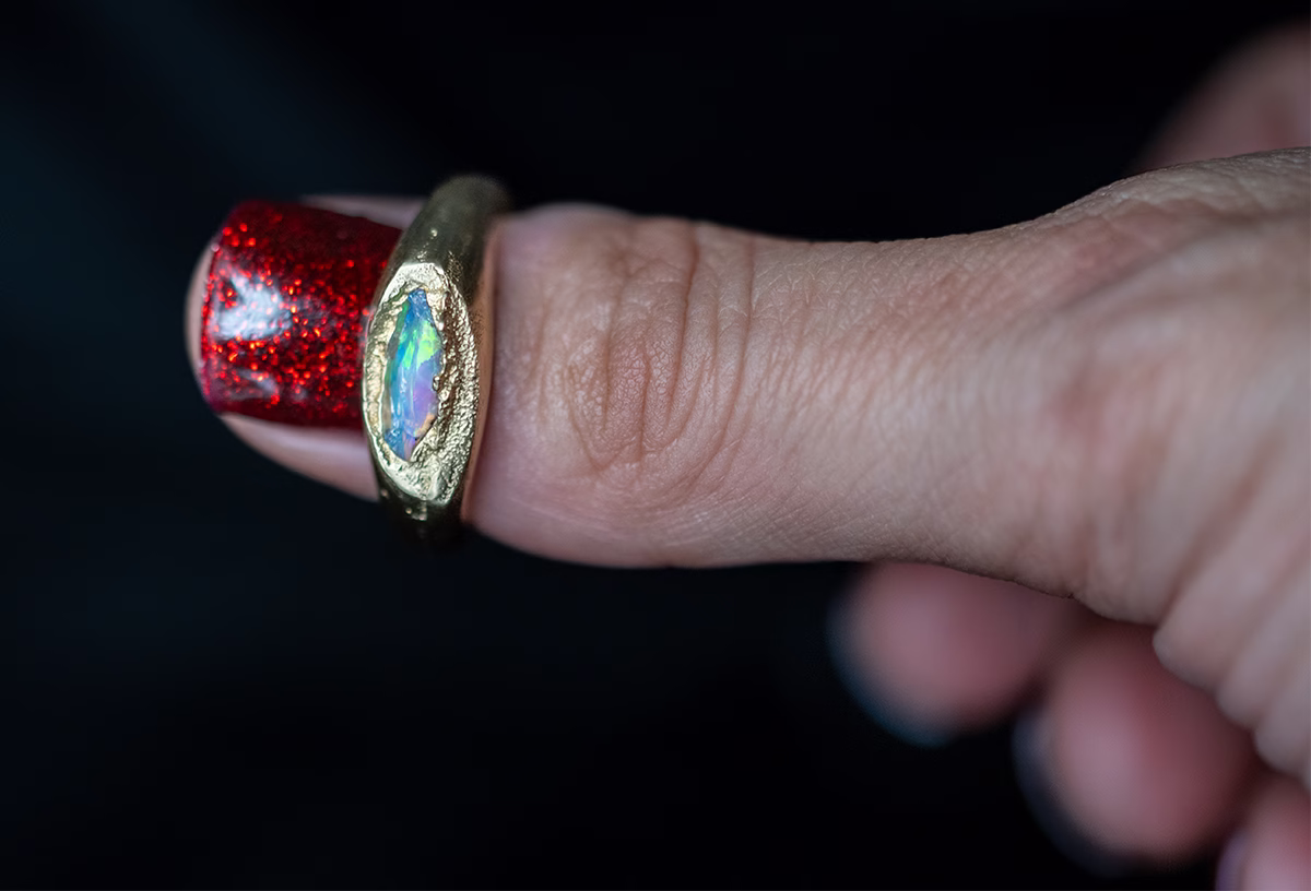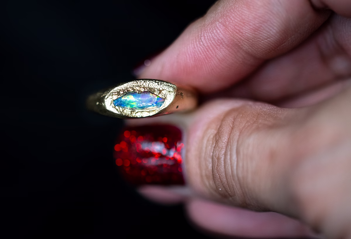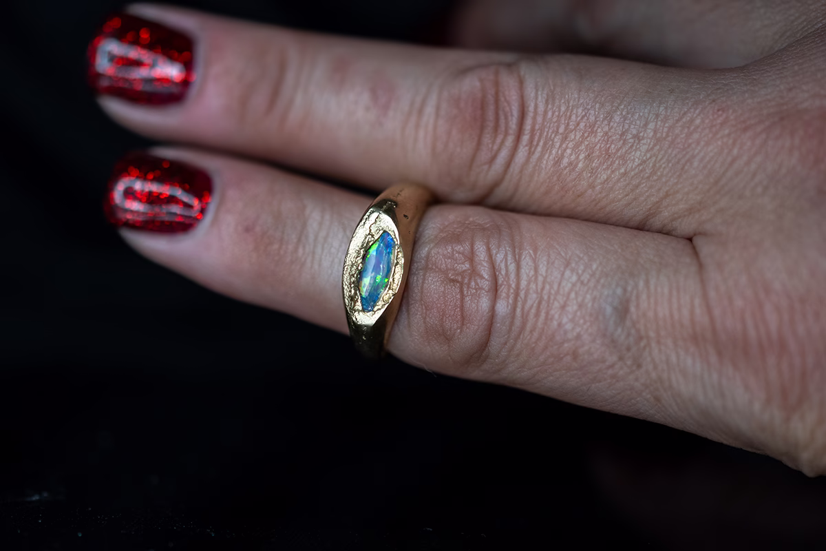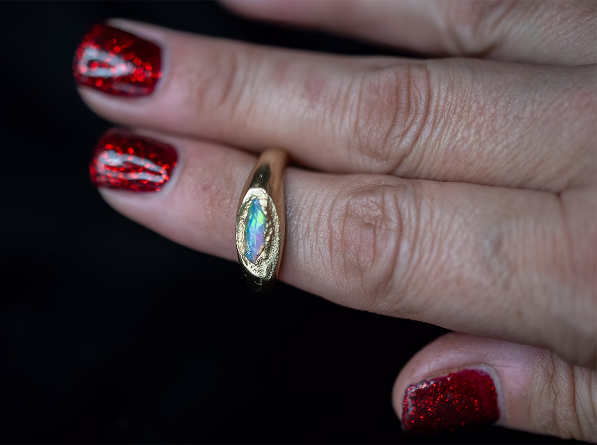 This exquisite handmade ring is meticulously crafted from high-quality 10 karat gold jewelry and casting grain, using the traditional sand casting method. This creative technique involves pouring molten gold into an open cavity made in fine red clay, resulting in a unique and beautifully shaped piece of jewelry.